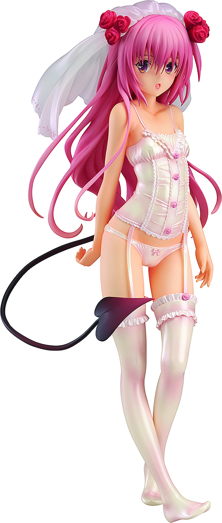 Nana Aster Deviluke! Just like the previous figures from the series, she has been sculpted wearing sexy lingerie with a wedding theme! The bridal veil and drapes make use of translucent parts to recreate their see-through appearance, and can also both be removed for a slightly different appearance! Enjoy Nana's devilish charm by your side!