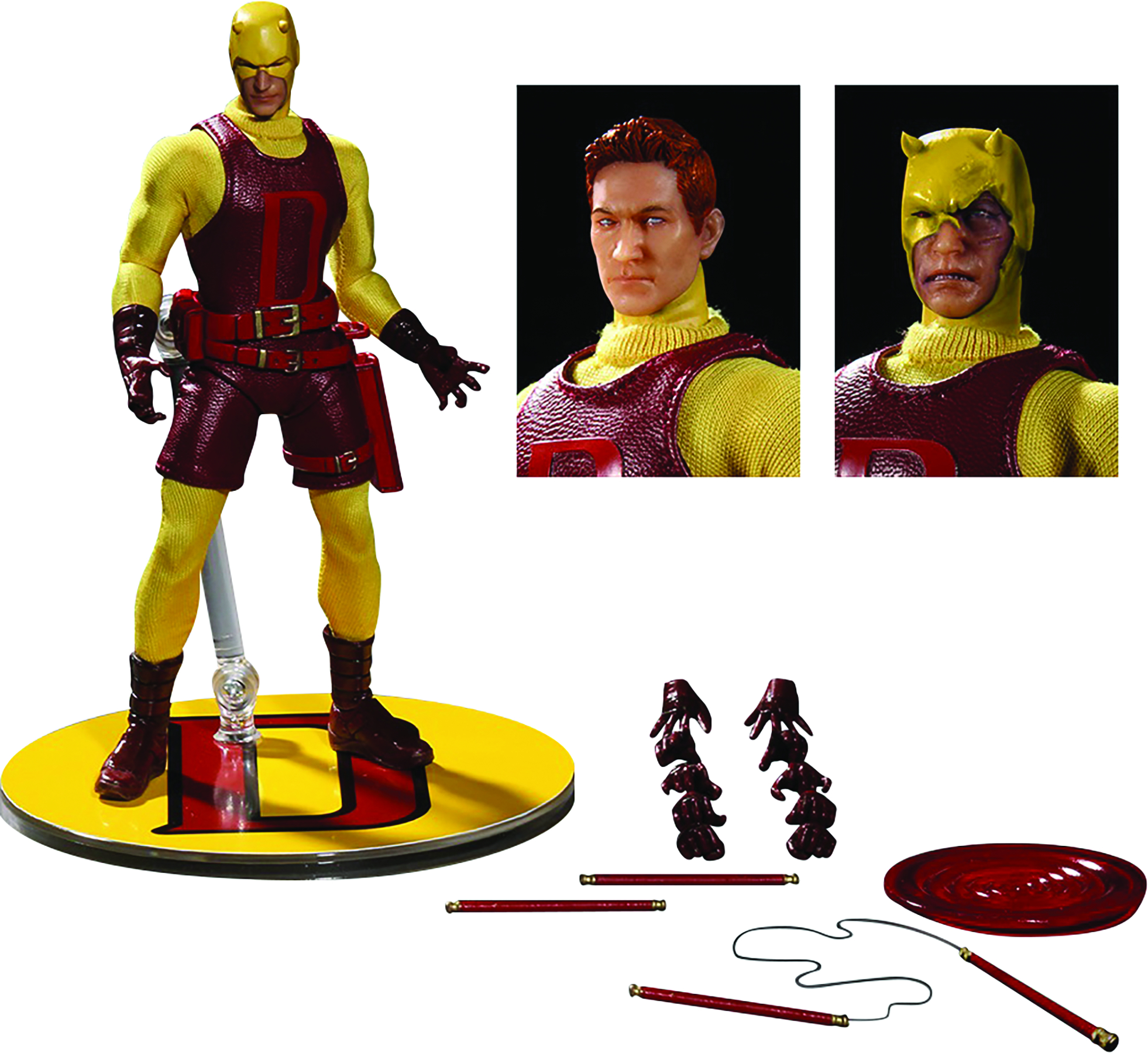 A PREVIEWS Exclusive! Blinded by a radioactive liquid while saving a stranger, young Matt Murdock gains "radar sense" and experiences heightened senses beyond normal human ability. After the brutal death of his Father, Matt Murdock donned his costume and became the man without fear - Daredevil. Lawyer by day and vigilante by night, Daredevil is the guardian of Hell's Kitchen. Painstakingly developed to capture the iconic look of the heroic character and outfitted on a One:12 Collective body, the costume is intricately detailed. The final result is a seamless blend of a timeless hero with a "real world" look. This 1/12-scale figure boasts 32 points of articulation and features an accurate real fabric uniform that recreates the Man Without Fear's original yellow costume.