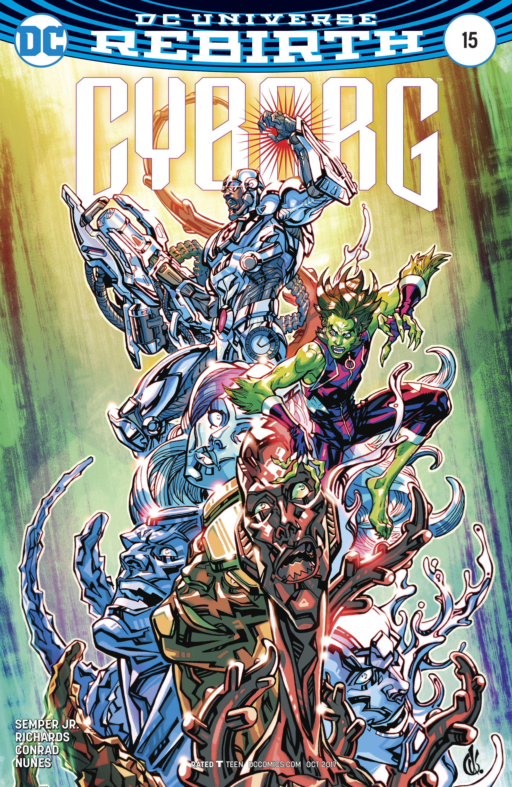 "AFTERMATH" part two! Anomaly's horrific dream is realized when the O.T.A.C. virus changes nearly all flesh and blood on Earth into cold hard steel. Now humanity's last hope, Cyborg, Beast Boy, and a band of rebels led by Vic's mother, Elinore Stone, embark on a suicide mission to find the cure. Their first obstacle? The infected super-scientist Doc Magnus and his newly twisted robot army, the Metal Men!