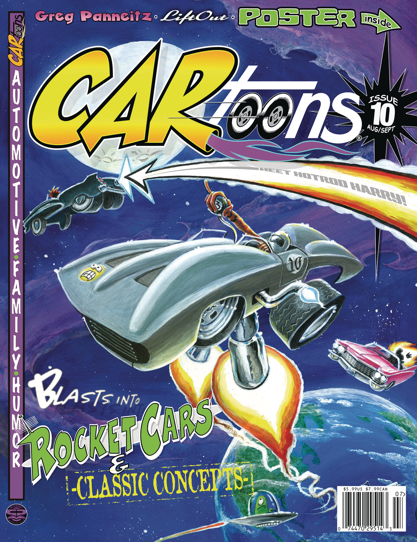 CARtoons is back with a new selection of Hot Rod-based B&W stories and artwork! Issue #10 features "Rocket Cars & Classic Concepts," those fantastically finned dream cars from the '50s and '60s who took their design tips from the growing Space Age of the era! It's 64 pages of pure, family-friendly automotive humor! If you love CARS, you will love