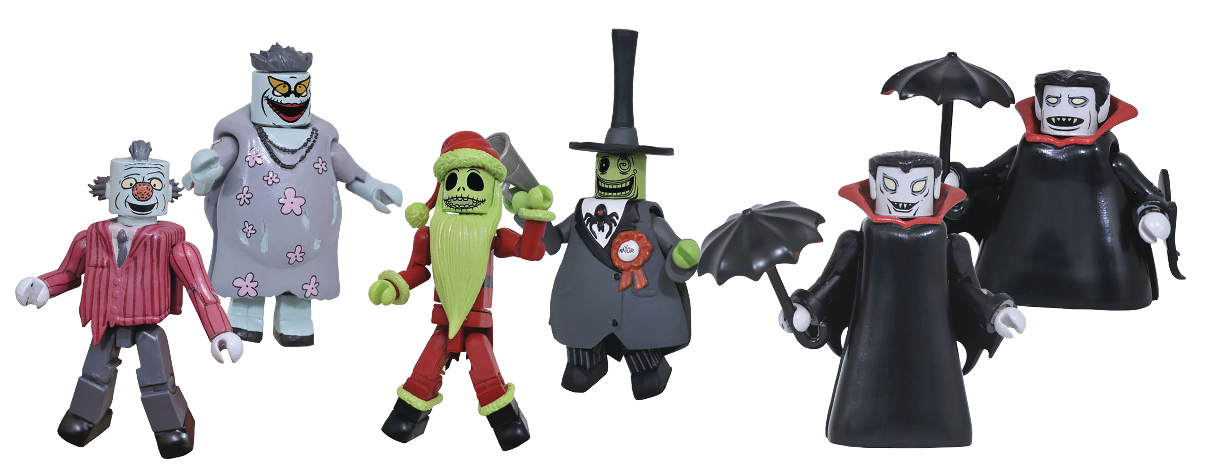 A Diamond Select Release! This new series of Nightmare Before Christmas Minimates will keep you up at night! The cast of creepy characters expands with three new 2-packs: Glow-in-the-Dark Santa Jack with Glow-in-the-Dark Mayor, the specialty-exclusive Corpse Dad and Corpse Mom, and two exclusive Vampires! Each 2-inch Minimates mini-figure features up to 14 points of articulation with fully interchangeable parts. Each 2-pack comes packaged on a full-color blister card.