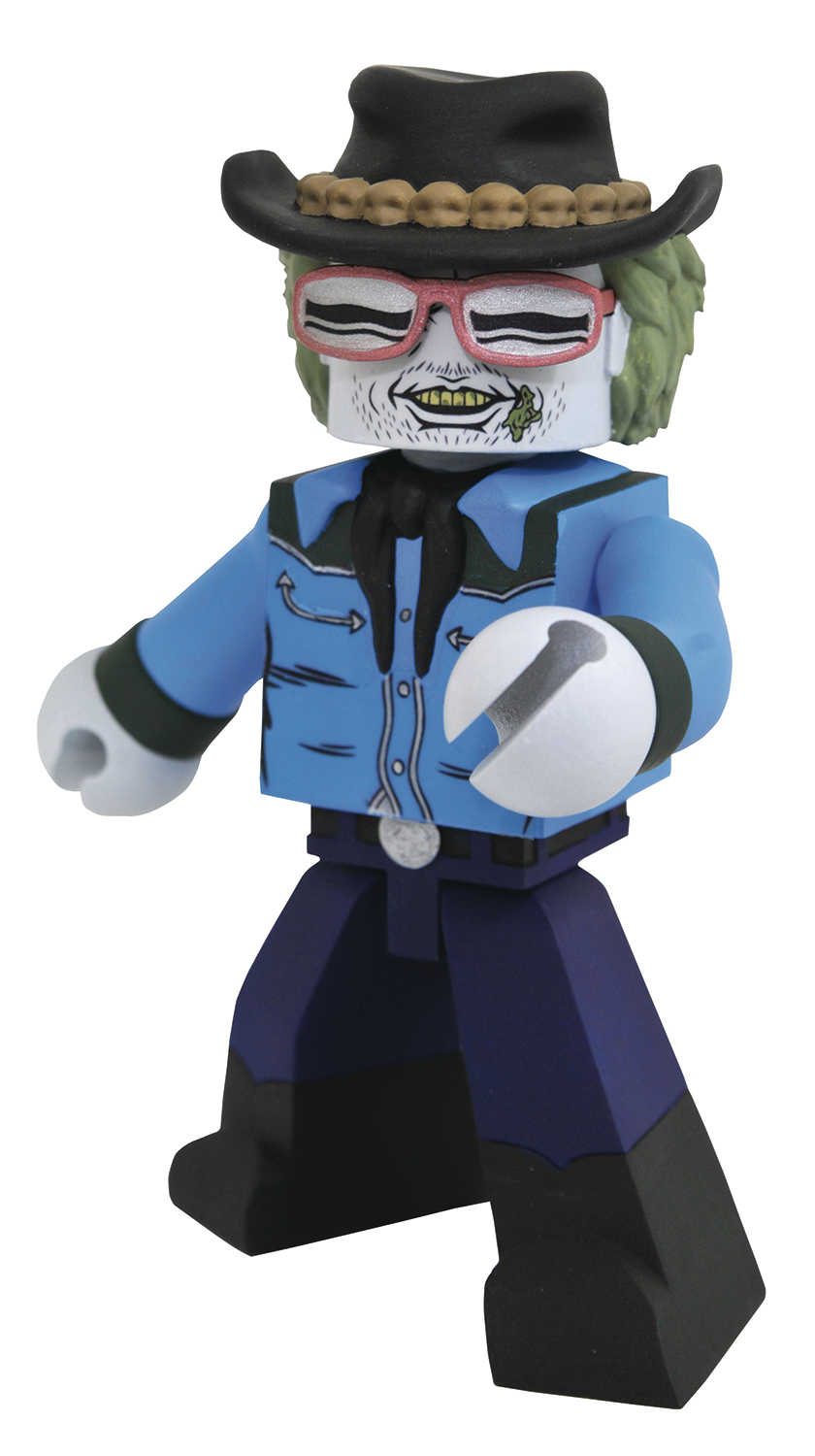 A Diamond Select Toys Release! He's the Ghost with the Most! Beetlejuice returns for a new batch of VInimates vinyl figures based on the classic Tim Burton film! Three new four-inch vinyl figures depict Beetlejuice in his cowboy duds, and Adam and Barbara Maitland in their spookiest scaring faces! Each figure is sculpted in the block figure style, striking a pose from the film, with an articulated neck for further posing options. Each Vinimates figure comes packaged in a full-color window box.