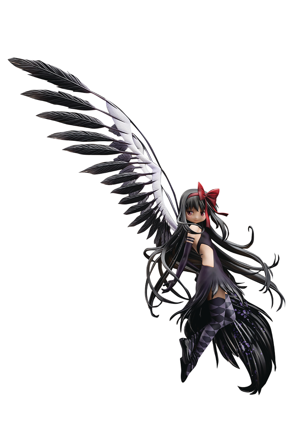 Puella Magi Madoka Magica the Movie: Rebellion comes an Aniplex+ figure of Devil Homura in 1/8-scale! With her raven black wings unfurled impressively behind her and the hint of a mischievous smile on her face, Homura has been sculpted to perfection just as she appears in artwork by original character designer Ume Aoki. At 15 3/4" tall, her dynamic design expresses every tiny detail, from her floating pose to her swirling dark purple hair and even the flowing, frayed ends of her skirt. Display her with Ultimate Madoka to keep them together for all eternity.