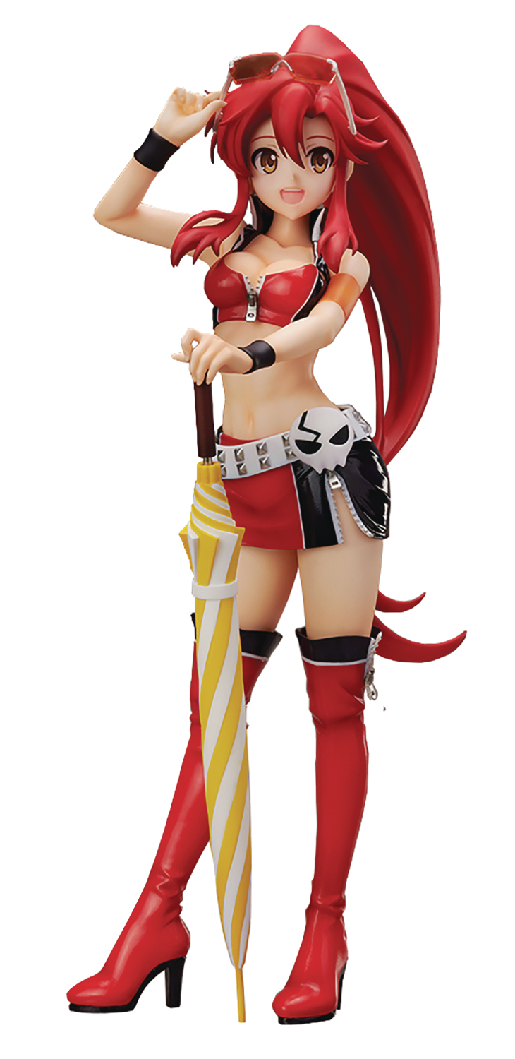 Yoko Littner dressed as a race queen! She comes wearing a sexy red and black two piece outfit, with a big belt featuring her signature skull design. Her top is slightly unzipped to let you enjoy a little more of her daring figure, and she comes holding a closed umbrella. Be sure to bring her home so you can enjoy her smile on your shelf every day!