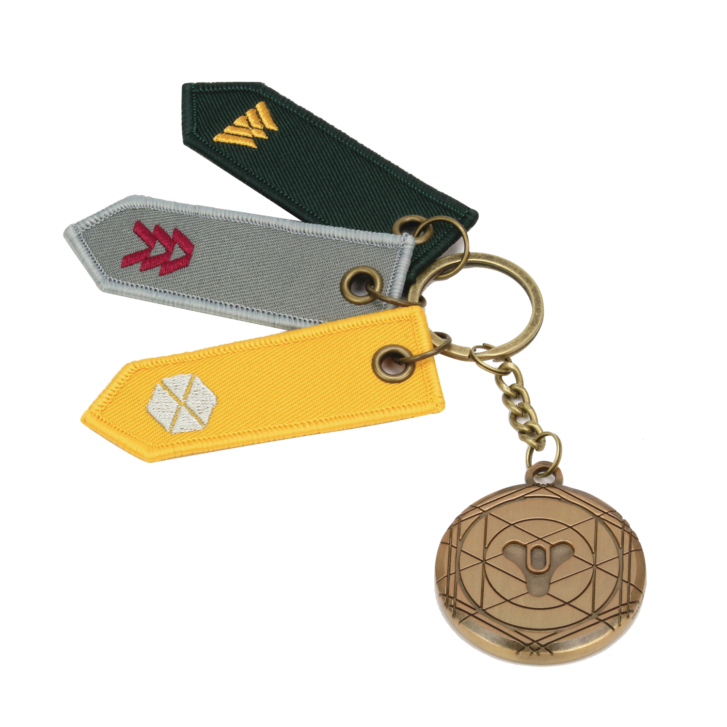 Destiny Guardian Keychain is an officially licensed product from the Destiny games. This keychain comes with three different emblem banners, each one representative of a different Guardian Class. The ring and chain are made up of heavy duty, intentionally distressed metal that gives it a worn look. It also features a Tricom keychain that measures 1 1/2" in diameter. The banners each measure 1" in width by 4" in height, and the split ring comes in a standard size in order to allow it to fit onto any key set that you own.