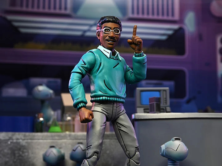 Baxter Stockman: evil genius or precocious programmer gone mad in pursuit of a petty pipe dream? This 7" scale action figure features comic accurate deco and comes with all new mouser, computer, miniature building, plus extra hands, and heads for perilous plug-and-play plundering. Window box packaging featuring new artwork by