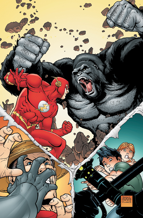 Primate fear! Estranged from Jay Garrick, The Flash is brutally double-teamed by the return of the one foe able to outdo Spin's psychic rampage with one of his own - Grodd! Meanwhile, a lowlife strikeforce, one with strangely cosmic trappings, targets the twins' fantastically developing powers! Four generations of the Flash legacy anchor this special issue!