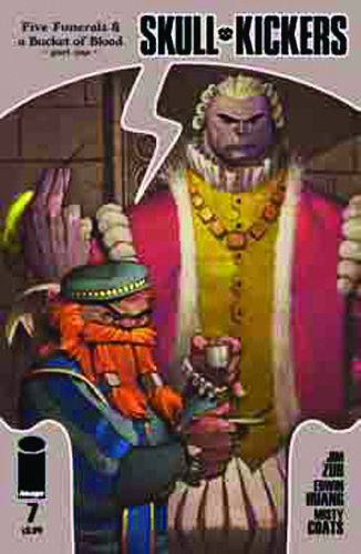 After the events collected in Image's hit trade paperback SKULLKICKERS, VOL. 1, the second SK adventure begins here! In this issue: a den of thieves, a city of danger, nobility, stupidity, dinner parties and bloodthirsty faerie folk. Jump onboard and see why Ain't It Cool News says: "Everyone who loves comics should buy Skullkickers."