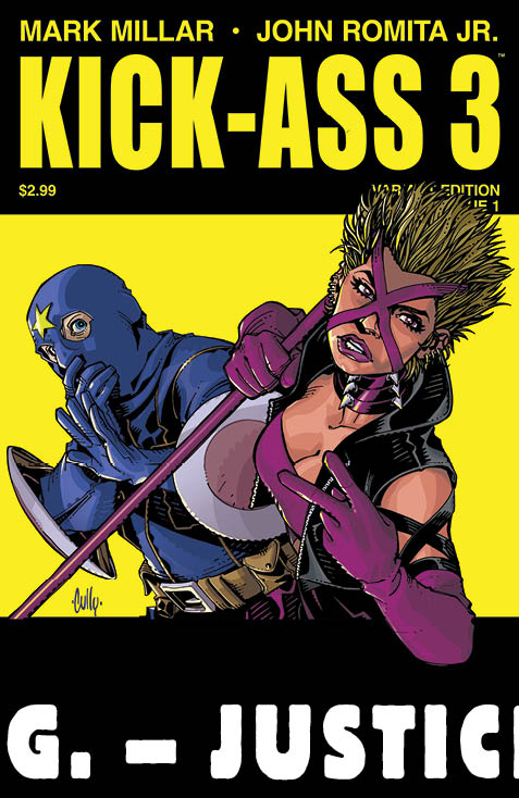 Kick-Ass and Hit-Girl's blockbuster return for the LAST EVER story arc of Mark Millar and John Romita Jr's mega-selling series. Hit-Girl's in jail, leaving Kick-Ass to lead the superhero team of Justice Forever. Their first mission: Bust Hit-Girl out of the clink. But superheroes have now been outlawed, leaving Kick-Ass to dodge both cops AND criminals. For the first time since donning the costume, Kick-Ass is beginning to have his doubts. Is he now in too deep to get out? The phenomenal follow-up to the Kick-Ass 2 movie coming this June. Issue #1 features six different covers by the industry's biggest artists, all available for order. Each cover will feature a different character, and when all six covers are linked, a special message will be revealed.