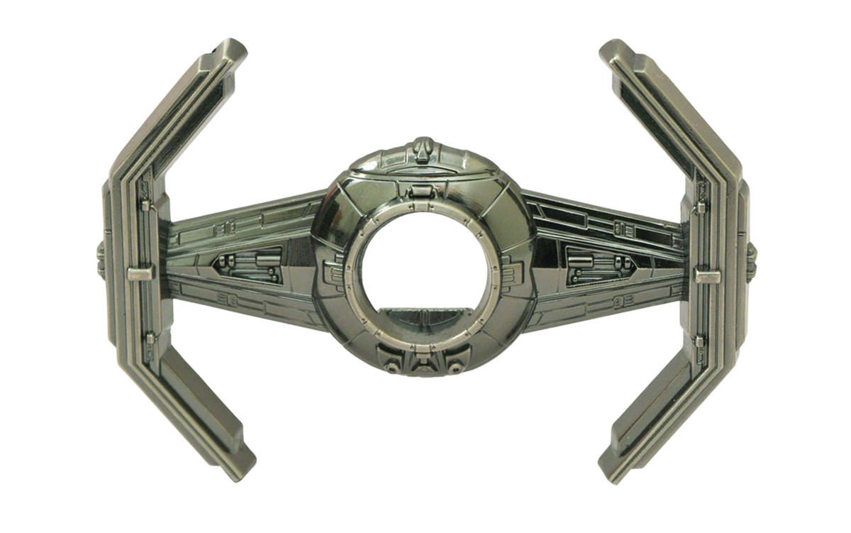A Diamond Select Toys Release! This bottle opener is right on your tail! Bottled beverages won't stand a chance against this solid metal bottle opener based on the Empire's tactical TIE Advanced x1 fighter! It measures 4 inches long, has magnets on the back and opens any bottle cap with ease. It's also highly maneuverable and can travel long distances - leave it on the fridge, or take it on a mission to your next party! Comes packaged in a collector's case with a full-color wrap.
