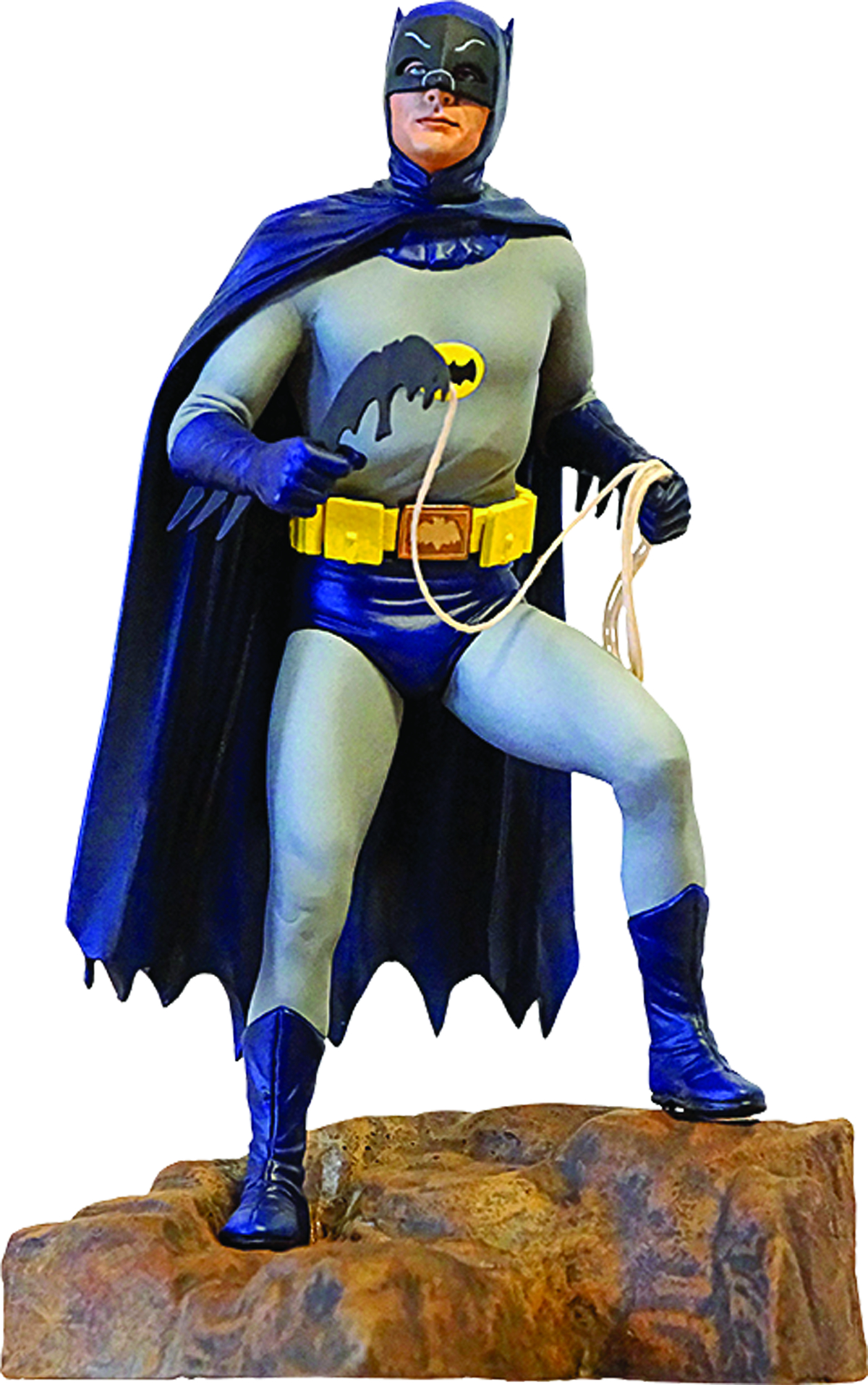 It's Adam West as Batman! This model comes complete with an interlocking base that forms the Bat-logo. More characters from the classic Batman television series are coming soon! Made of plastic, the kit requires paint and glue for final assembly.
