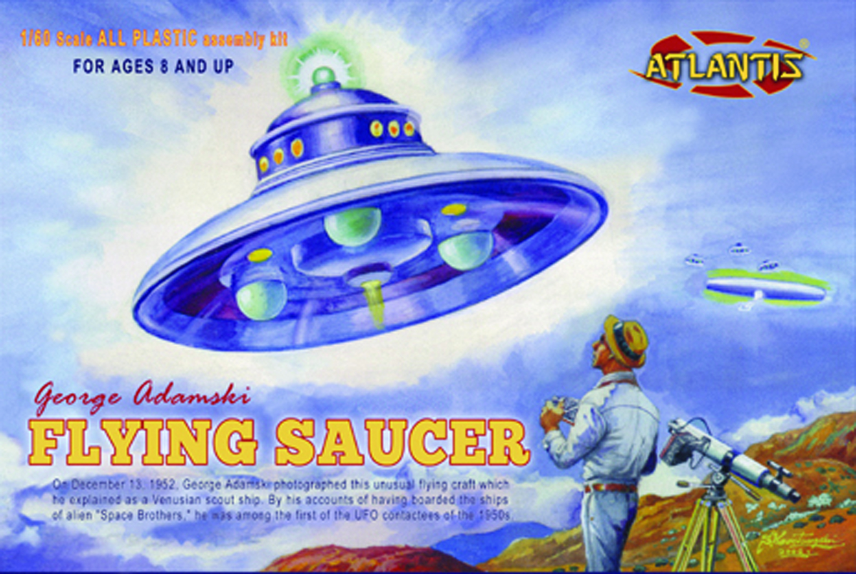 On December 13, 1952 George Adamski photographed an unusual flying craft which he explained as a Venusian scout ship. By his accounts of having boarded the ships of the alien "Space Brothers," he was among the first of the UFO contactees of the 1950s. This 1/60-scale kit is based on Adamski's sighting. Molding in color and clear parts, the flying saucer measures of 6" in diameter.