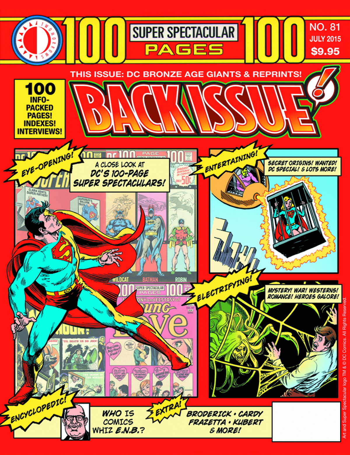 This is a special 100-page full-color edition spotlighting DC Bronze Age Giants and Reprints! We open DC Comics' vaults for an in-depth exploration of its 100-Page Super Spectaculars! Plus: a history of comics giants, DC indexes galore, and a salute to "human encyclopedia" E. Nelson Bridwell. Featuring the work of Pat Broderick, Rich Buckler, Frank Frazetta, Joe Kubert, Bob Rozakis, Bernie Wrightson, and more. Super Spec tribute cover featuring classic art by Nick Cardy! Edited by Michael Eury.