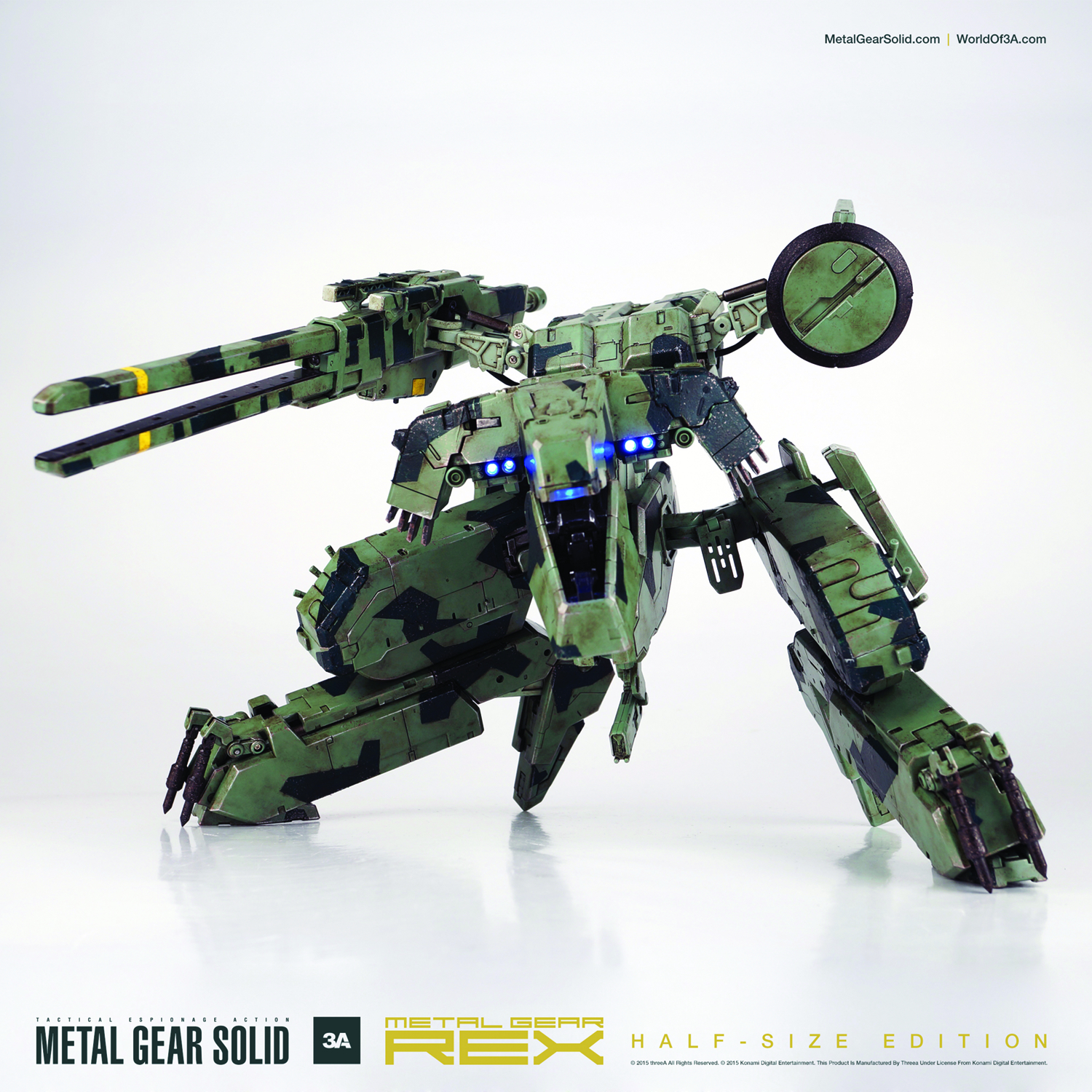 Metal Gear Rex returns by popular demand, this time in a Half-Size Edition much friendlier for smaller spaces. Rex retains the Light-Up system and incredible level of detail as its larger counterpart! The half-size edition features improved articulation including the ability to turn its head. Hatches on the knees and back-unit open and close -- no removal necessary! Comes with a Railgun measuring nearly 12" long and has a resting height of more than 8". The rail gun and head have the same illumination features as on the original full-size edition. (Requires 9 AG1 batteries, not included.)