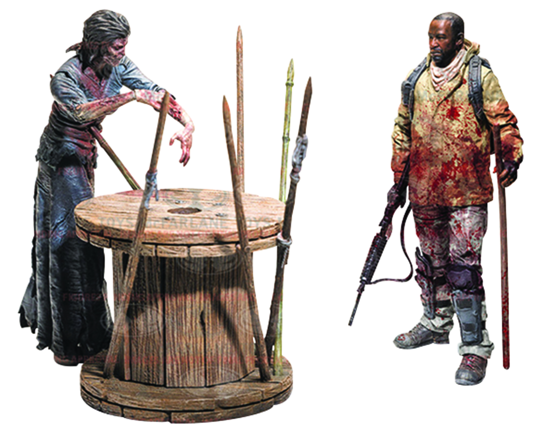 From McFarlane Toys. Suffering from the loss of his son at the hands of his wife-turned-walker, Morgan Jones began to lose touch with his humanity. As seen in the hit series' Season 3 episode "Clear," Morgan devises intricate and complicated traps to shield himself from both Walkers and Humans alike. Time and experience gives Morgan a new sense of clarity as he sets out to find Rick Grimes. This Deluxe Box features: a blood-splattered "Survivor Edition" version of Morgan Jones with assault rifle, walking stick, backpack, and 22 points of articulation; a bloodied Walker Spike Trap made of a wooden cable spool (2-3/4" wide x 2-1/2" high) with six removable spikes (4 5/8" high); a fully assembled Walker Spike Trap approximately 4-5/8" wide and 4-5/8" high); and a removable female Walker Figure that can be impaled onto the spikes.