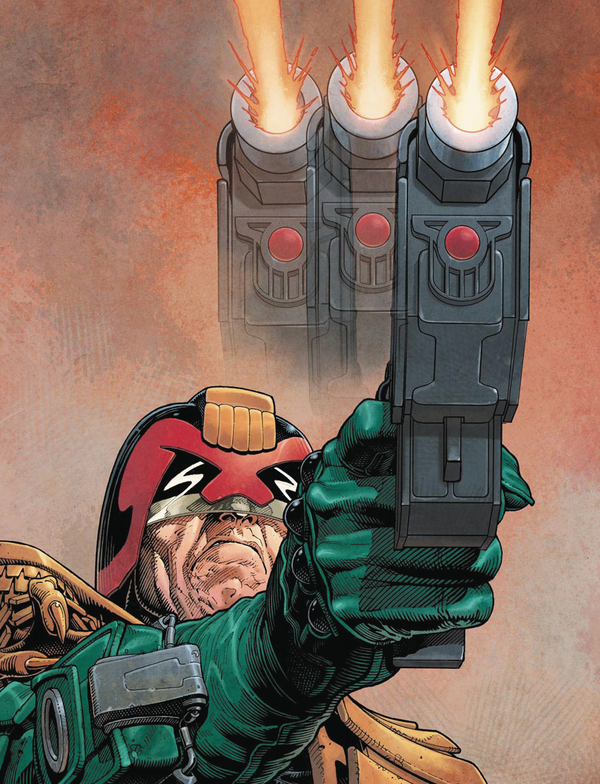 Judge Dredd: "The Lion's Den" by Michael Carroll and PJ Holden, the conspiracy tightens on Judge Joyce as he goes on the run in Brit-Cit, and the power struggle continues in Mega-City One. Elsewhere, the Survival Geeks have a cuckoo in the midst in "Lord of the Ringers" by Gordon Rennie, Emma Beeby and Neil Googe; the investigation continues in the darkest of deep space in "Brink" by Dan Abnett and INJ Culbard; a planet succumbs to the Dark Judges in "Tainted: The Fall of Deadworld" by Kek-W and Dave Kendall; and the third book of the Brutania Chronicles begins in