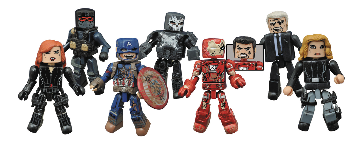 A Diamond Select Toys release! Get ready for Round 2! The action of Marvel's Captain America: Civil War continues with a second assortment of Minimates mini-figures based on the film! In this next batch of two-packs, Battle-Damaged Captain America takes on Battle-Damaged Iron Man, Black Widow meets Crossbones, Agent 13 faces an evil Thug and a rare, one-per-case variant set pairs Secretary Ross with another Thug! Each 2-inch Minimates mini-figure features 14 points of articulation, as well as character-appropriate accessories and fully interchangeable parts. Designed by Art Asylum!