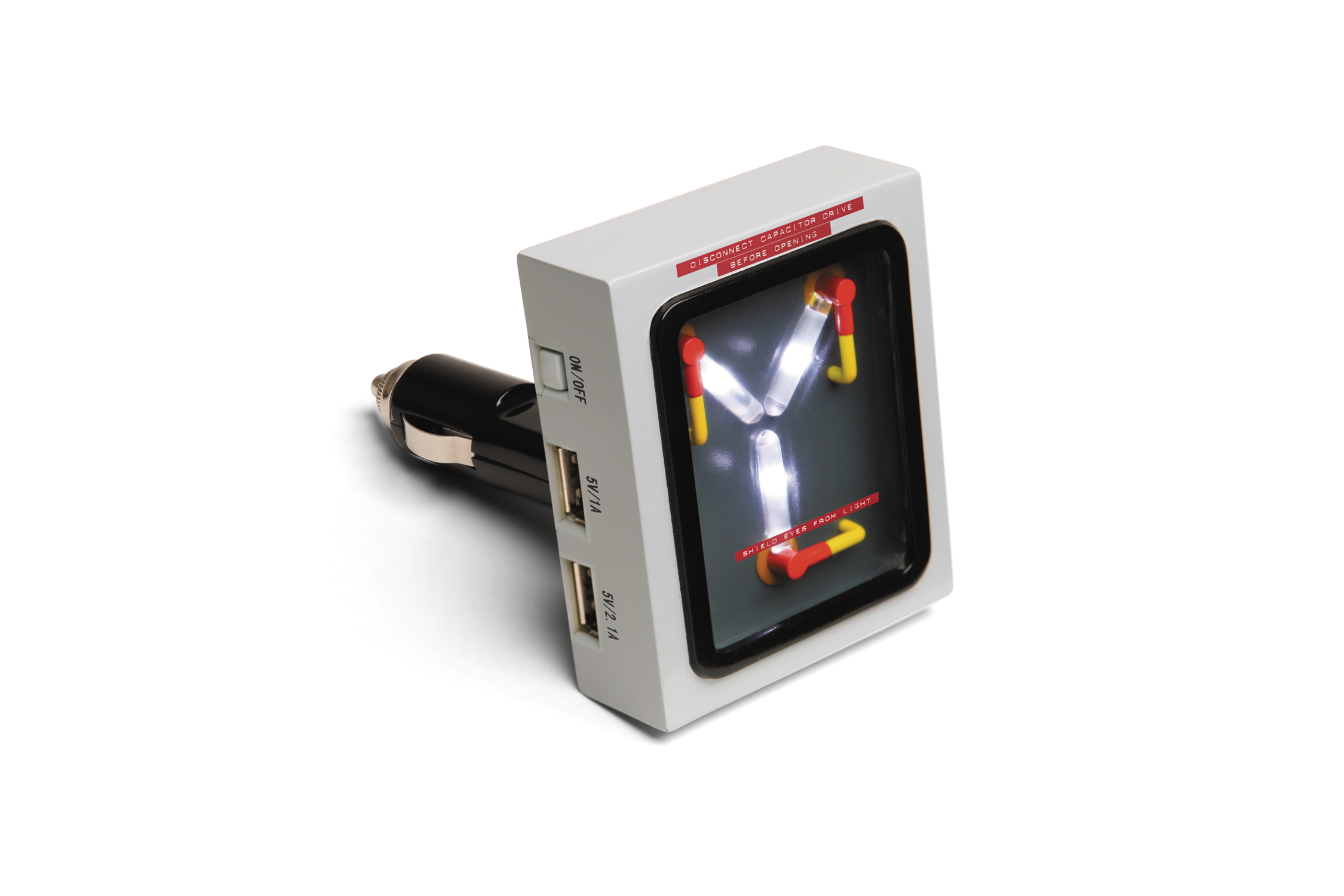 Great Scott!! Marty has travelled back in time and taken the Flux Capacitor with him. We're not exactly sure where, so Doc Brown has authorized ThinkGeek to make these smaller Flux Capacitors so you can search time for Marty. Each one is capable of returning to a specific point in time, so you can join the search. Just plug it into your car's 12V vehicle power adapter (cigarette lighter) and turn it on. 88 m.p.h. and... ok, don't go that fast. That would be bad, because the Flux Capacitor Car Charger won't really take you through time, but it will charge all your USB-powered goodies. Each Flux Capacitor Car Charger has two USB ports, each capable of charging almost any USB powered device (1 x 1A and 1 x 2.1A). But it also has that beautiful Flux Capacitor light sequence we all know and love. Even traffic jams (either terrestrial or aerial, if your car is powered by Mr. Fusion) won't bother you because your device will be charging and the Flux Capacitor Car Charger's pulse will make you feel more important than anyone else.