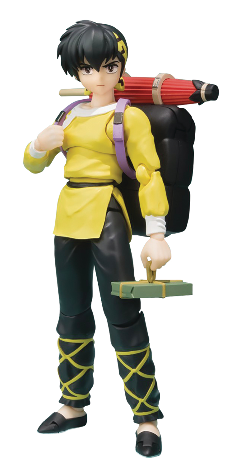 From Tamashii Nations. Ranma's rival, Ryoga Hibiki, joins S.H.Figuarts! The 6" figure includes 7 optional right hands and 6 optional left hands, 3 optional expression parts, Ryoga's umbrella, an optional backpack, one part for holding an umbrella, one base part for fixing the backpack and a set of base of its own.