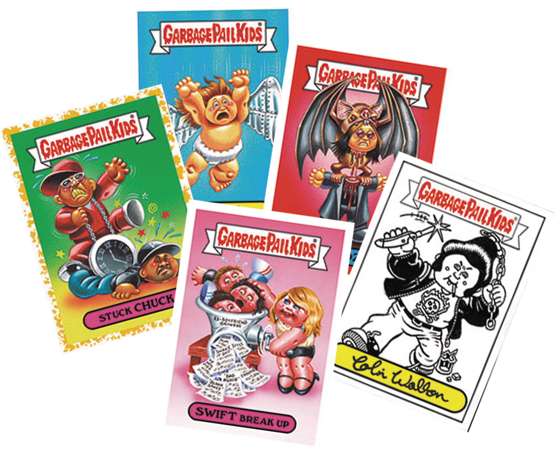 The Garbage Pail Kids are invading your headphones! Battle of the Bands features all-new art, parodying bands, singers and musicians, broken down into genre-specific subsets. 180 Themed Base Sticker Cards with 90 A & B names featuring all-new art! One Hit Per Hobby Collector Box, also featuring Sketch and Autograph card! Collect them all! 9 cards per pack, 24 packs per box.