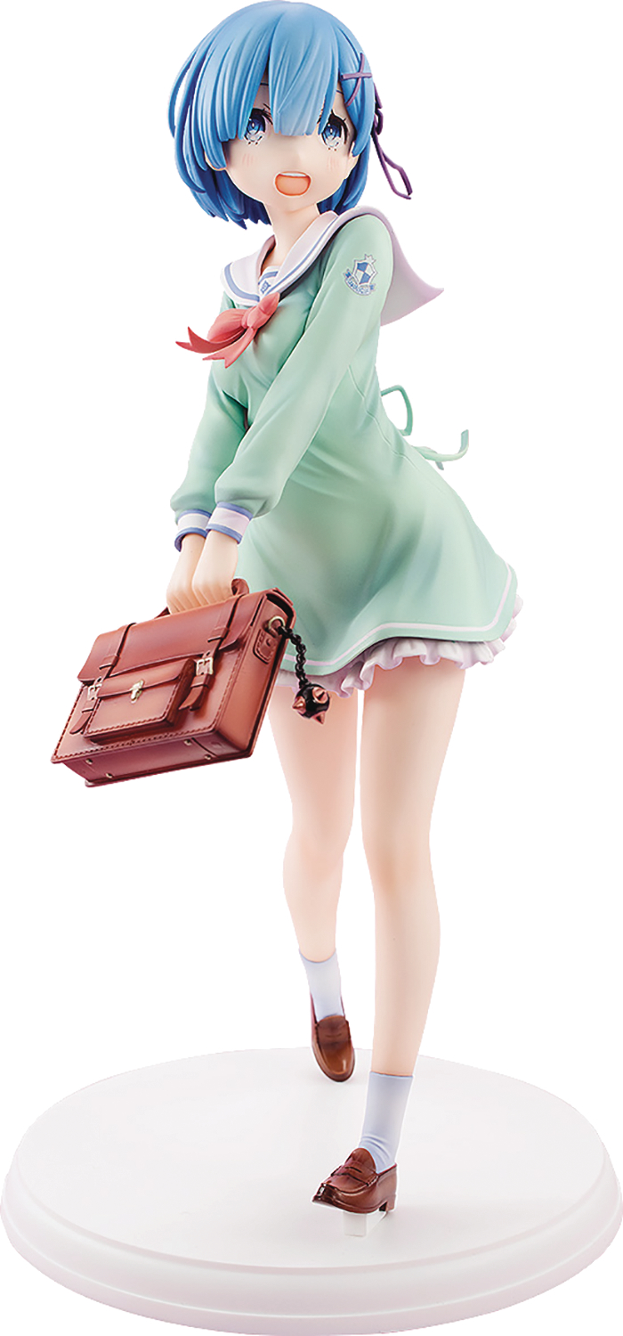 Rem wearing a high school uniform! The figure is based on an illustration used during a 2017 Spring campaign, and features her walking with a confident stride and a lovely smile on her face. Her rather short shirt blowing about in the wind, the sailor's collar and her short hair have all been carefully sculpted for fans to enjoy by their side. Her school bag as well as a morning star are included as accessories.