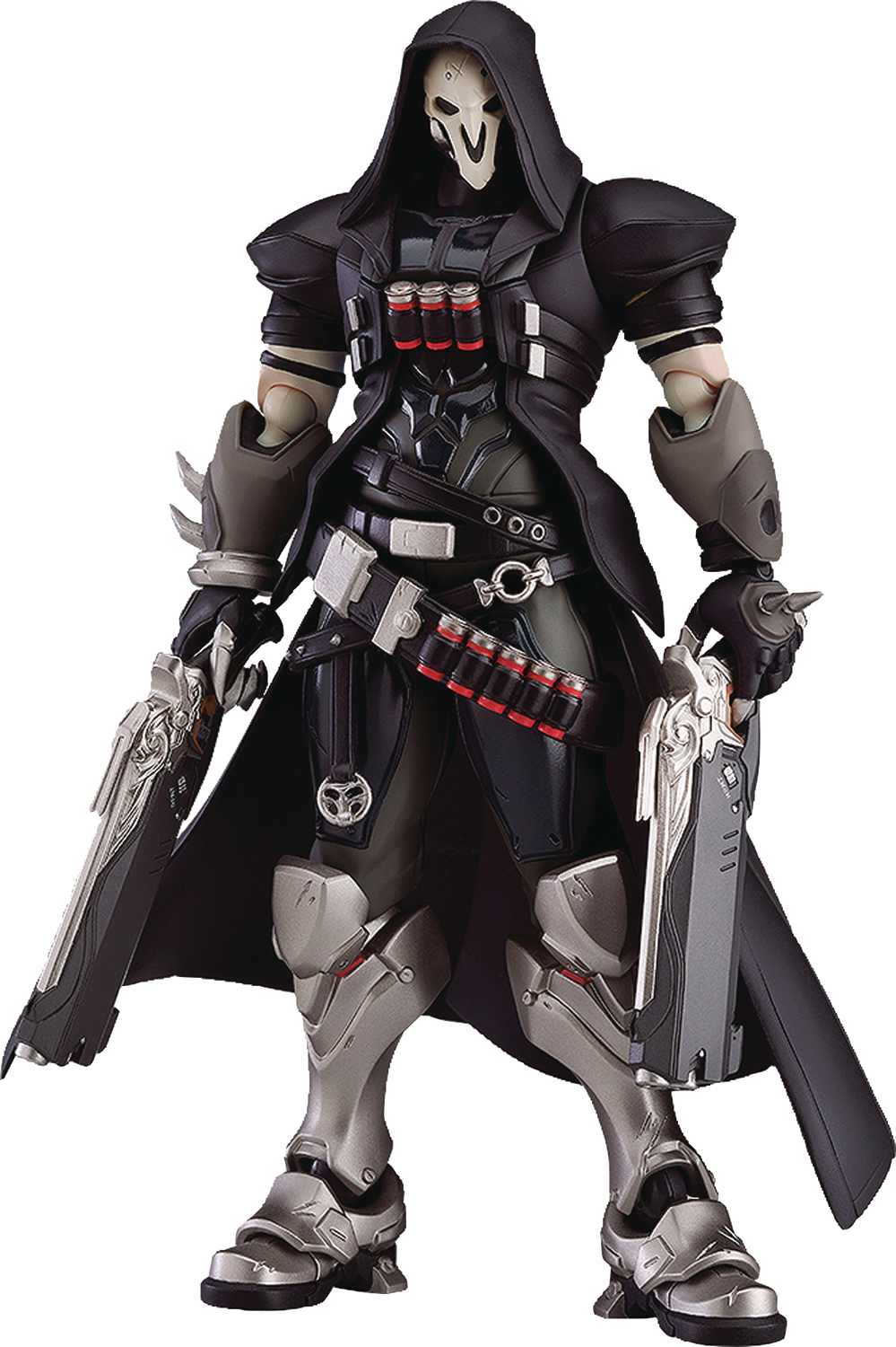 Overwatch comes a figma of Reaper! The smooth yet posable figma joints allow you to act out a variety of different scenes. A flexible plastic is used in specific areas, allowing proportions to be kept without compromising posability. His twin hellfire shotguns are included to display him ready for battle. Effect parts can be attached to the Hellfire Shotguns to recreate his Death Blossom ultimate. A Shadow Step effect sheet is included which can be placed at his feet to pose him using the ability. Nine different hand parts including open hands, clenched hands and a thumbs down hand are all included. Also included is an articulated figma stand to facilitate various exciting poses.