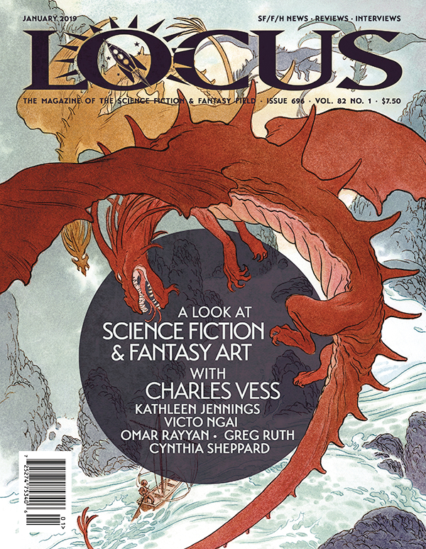 Locus includes the 2019 Hugo ballot, convention coverage from the International Conference on the Fantastic and the Williamson Lectureship, commentary from Cory Doctorow, people notes, and news covering industry sales and releases, along with awards, books listings, and more.