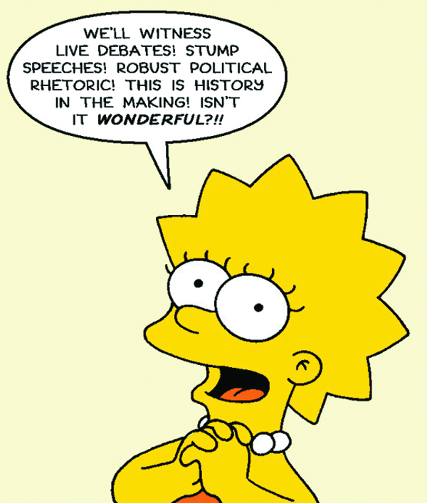 Springfield is rocked by a raucous caucus of campaigning politicians, which proves that no private citizen is safe in an election year. Then Marge's helpful advice and homespun wisdom make her the flavor of the day and the most recent television talk show sensation. Includes a Li'l Homey story and an bloody baseball game between Itchy and Scratchy. (Collects