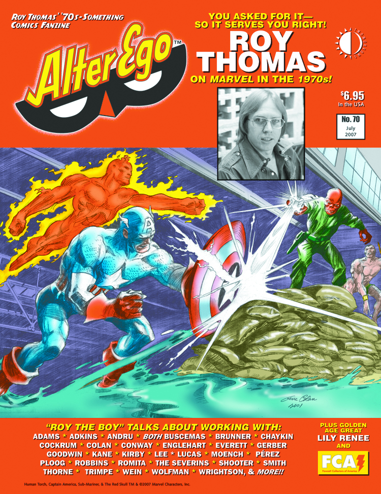 Alter Ego spotlights Roy Thomas during the 1970s! It's a "you-asked-for-it" follow-up to issue #50, on Roy's stint as Marvel's editor-in-chief and one of the company's major writers. Plus, there's art and reminiscences of both Buscemas, Gil Kane, Neal Adams, John Romita, Howard Chaykin, Frank Brunner, Mike Ploog, Bernie Wrightson, Bill Everett, George P rez, Frank Robbins, Barry Smith, Frank Thorne, Herb Trimpe, and a passel of talented writers (including a guy named Stan)! Also, there's FCA (Fawcett Collectors of America) with Marc Swayze, C.C. Beck, and others; Michael T. Gilbert and