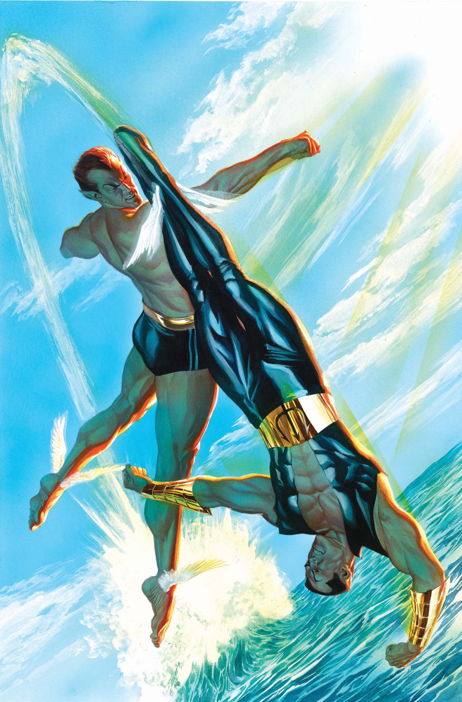 The King of Atlantis vs the Prince of Atlantis with an entire kingdom as the ultimate prize. Alex Ross, Jim Krueger and Steve Sadowski continue the year's most surprising cross-time epic with a battle that promises to tear two centuries asunder. Plus, more clues to the mystery of just how the Invaders landed in 2008!