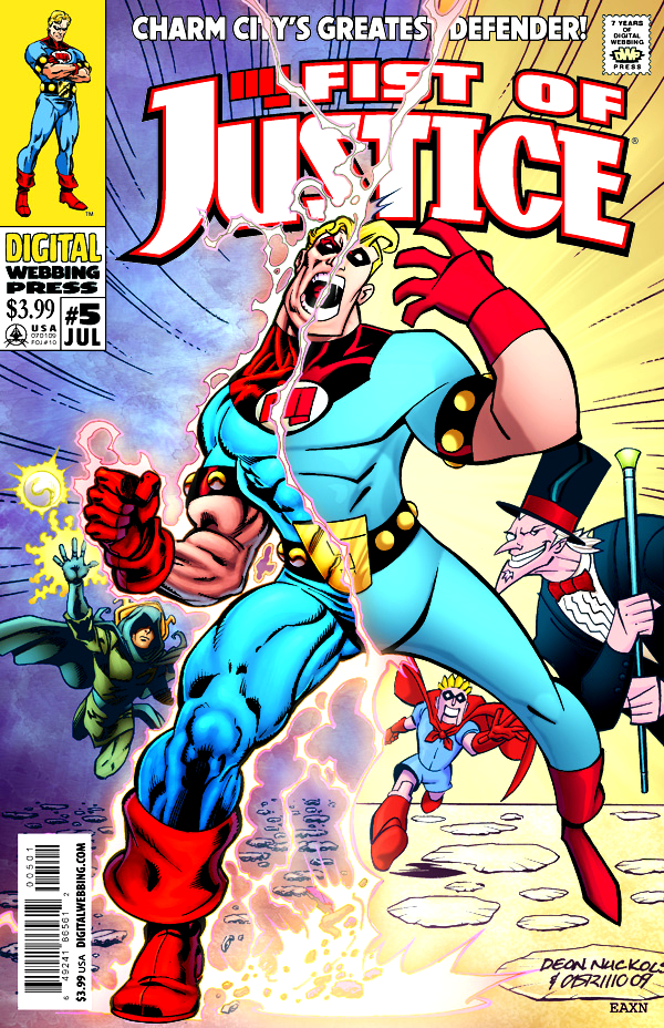 As if being in a cartoon wasn't bad enough, Fist of Justice finds himself locked in a race with the fate of the Earth at stake. Introducing Fist of Justice Lad and an ending featuring the in-continuity return of a popular villain that you can't miss! And what's any of this to do with the twisted Dr. Dibuk?