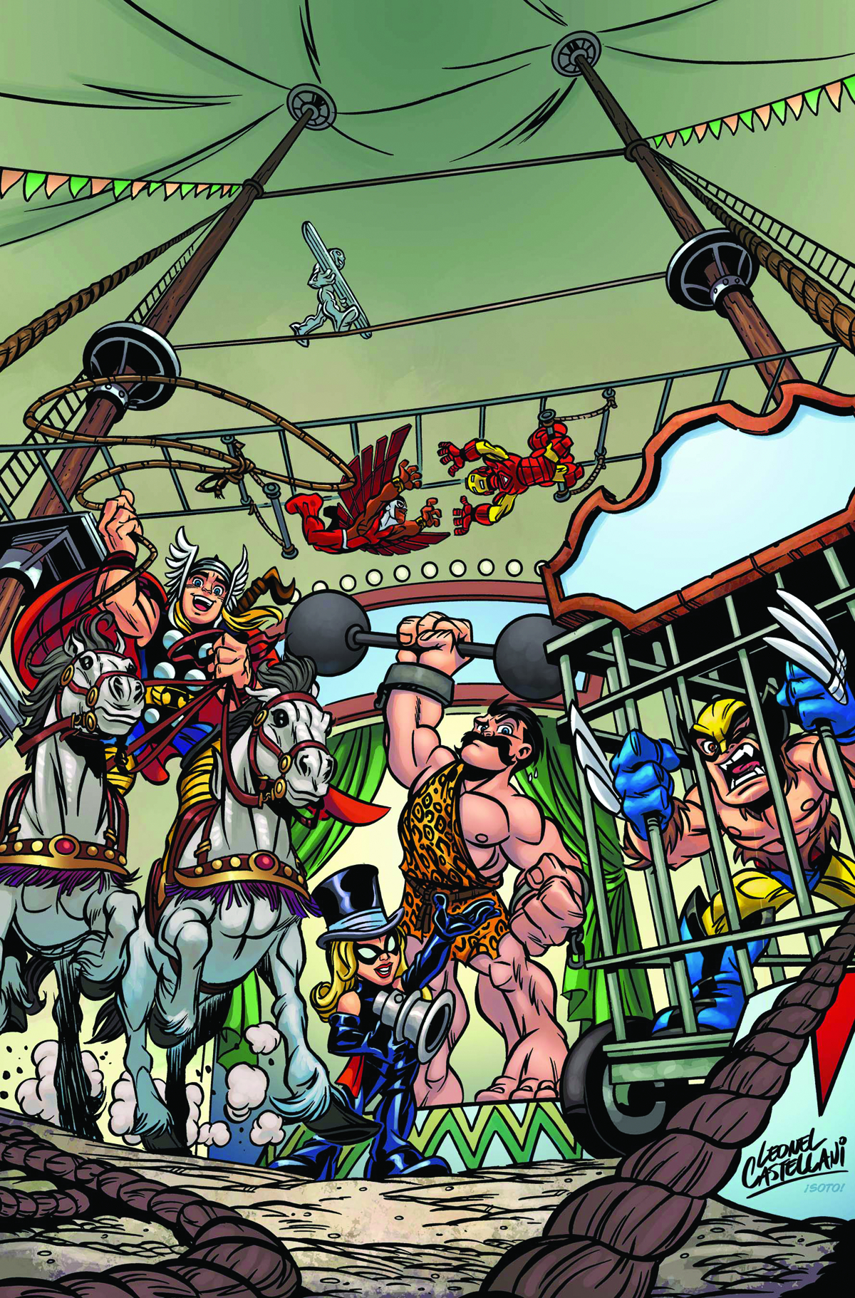 "SUPER HERO CIRCUS!" The hypnotic Ringmaster takes the center ring as he mesmerizes the Squaddies to think they are circus performers--keeping them busy while Doom's Lethal Legion attempts to retrieve some Fractals from the SHIELD Helicarrier!