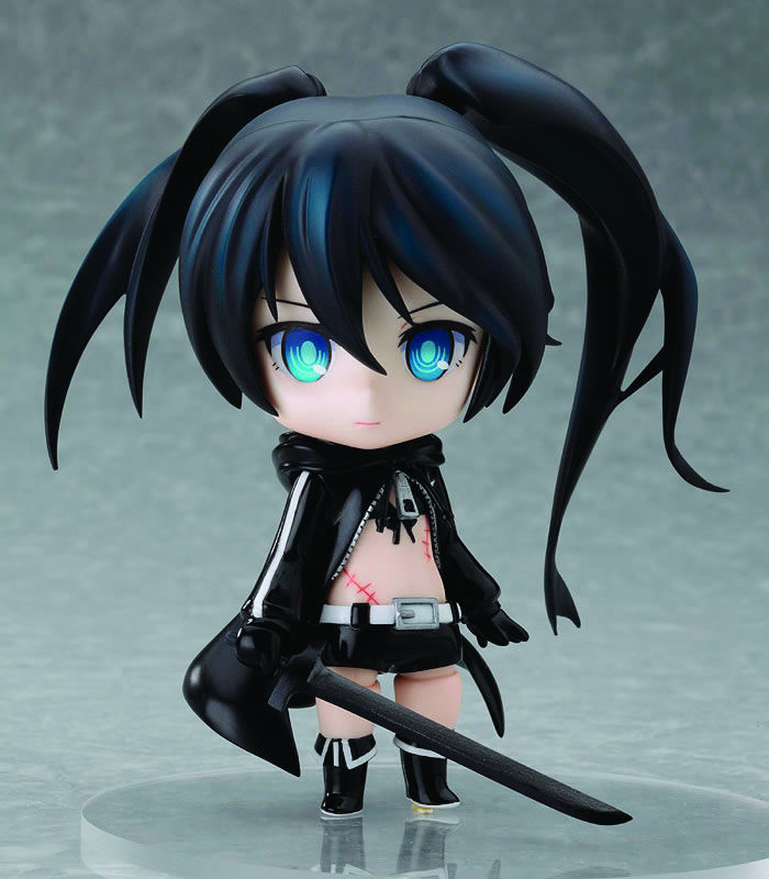 Black Rock Shooter is joining the Nendoroids! She comes complete with her Rock Cannon and Black Blade, and even comes with the checkered stand that has become a staple for her to stand upon. Additionally, extra hair parts based on the illustration by CHAN X CO are also included and can be replaced with the standard hair whenever you feel like a change! Enjoy all the different sides of Black Rock Shooter! Window box packaging.