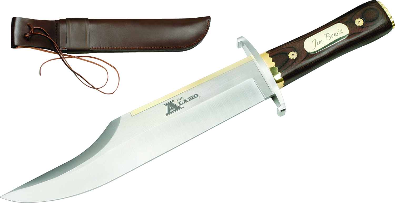 The Alamo. The knife has overall length of 17 1/2" with an 11 1/2" Stainless Steel/Brass-Plated Spine Blade. The blade has a thickness of 1/4" and a 6" genuine wood handle with Jim Bowie signature plate. Includes genuine leather sheath and Certificate of Authenticity.