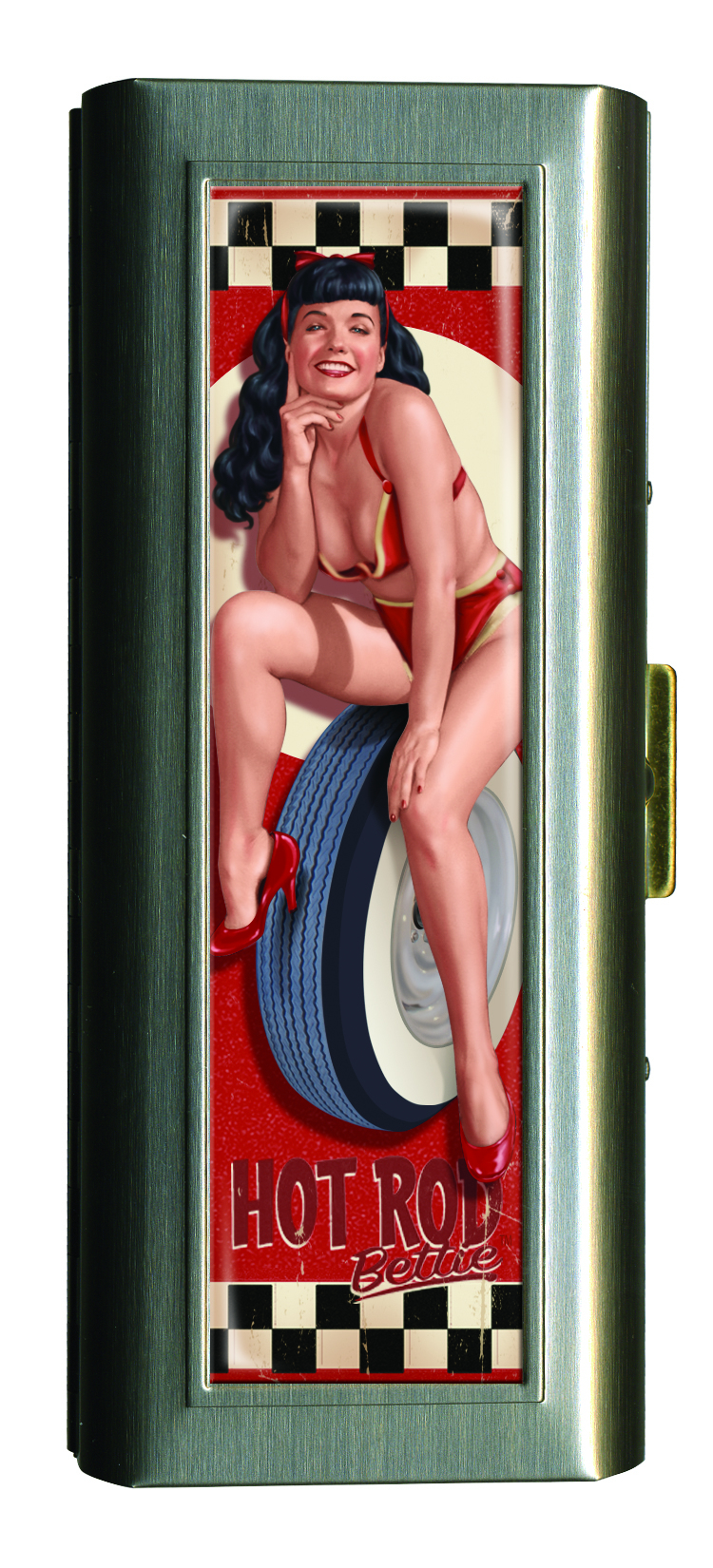Retro-a-go-go! has added color to some classic Bettie Page shots, and these are their best designs yet! Rev your engine for hot-rod Bettie and soothe your senses with aquamarine Bettie. And that's not all . . . two new styles coming next month!