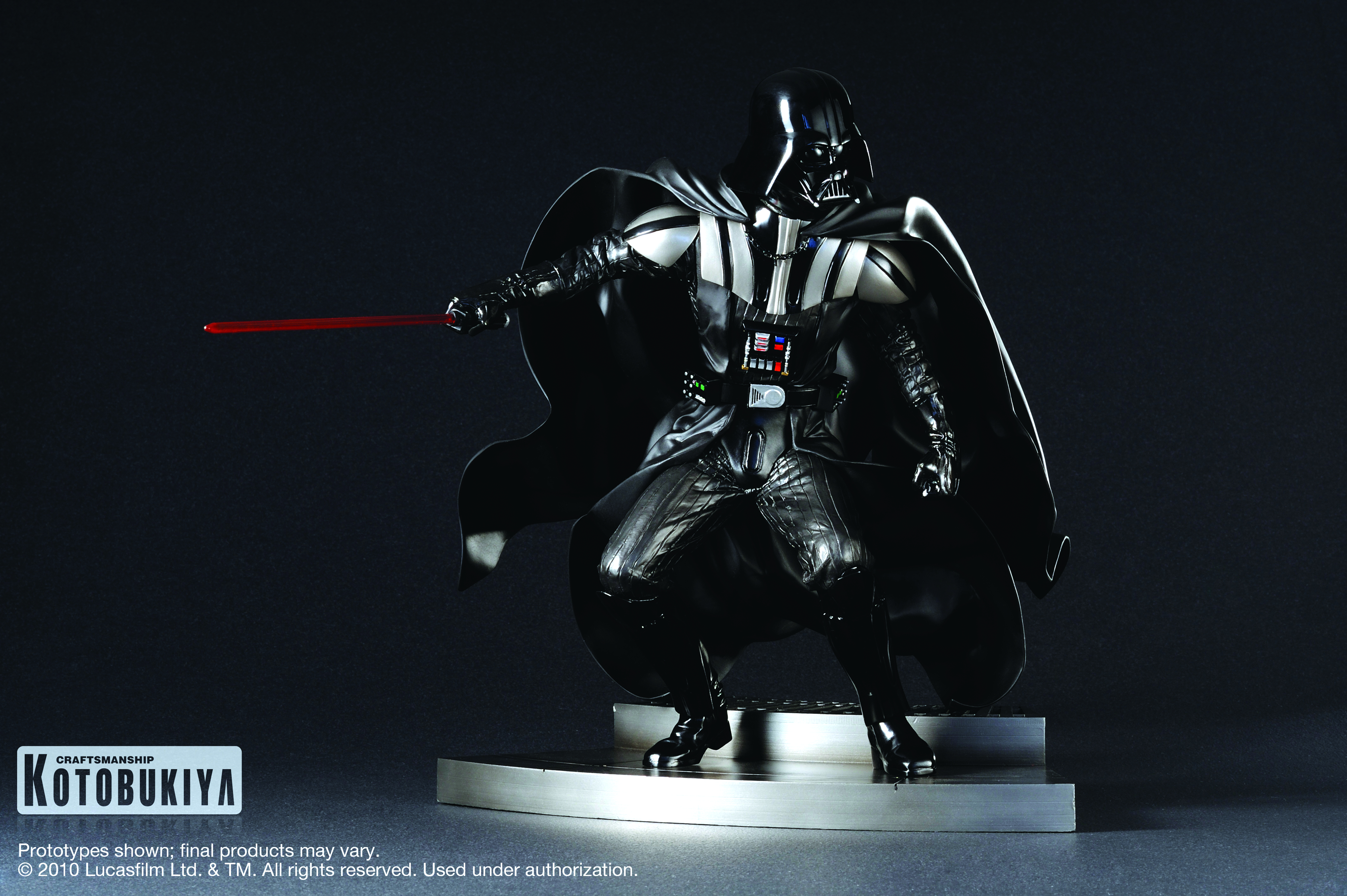Star Wars universe to life in a dynamic 1/7-scale. Darth Vader wields his crimson lightsaber in mortal combat against anyone foolhardy enough to challenge the might of the Galactic Empire. His classic armored suit features intricate sculpting to bring out the different parts of his chest piece and belt module, while Vader's long cape flows around him in the heat of battle. With his knees bent and weapon extended in his right hand, Vader is ready for anything, even upstart Jedi Knights. Darth Vader stands 11" tall (1/7th scale) atop an exclusive Death Star panel display base.