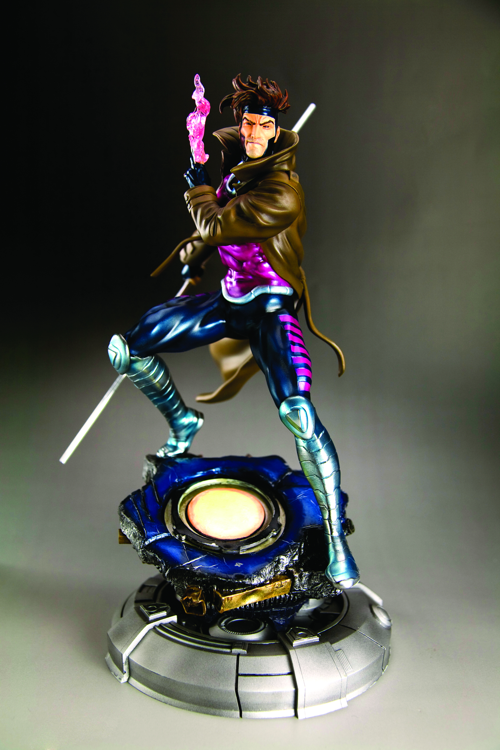 Always confident in the face of overwhelming odds, Gambit shows he's ready for action in the midst of a particularly harrowing training session.  Garbed in his unique metallic blue, purple, and silver costume, the X-Man stands tall in a battle-ready stance with his signature brown overcoat whipping in the air behind him.  Gambit carries his two favorite weapons with his bo staff in his right hand and a trio of playing cards fully energized (via a stunning translucent pink effect) in his left.  The mutant hero's sculpt is top notch, bringing to life every element of his clothing and his athletic physique.  Gambit's wild hair erupts from the top of his open-faced cowl, while his face captures the character's devil may care smile perfectly.
