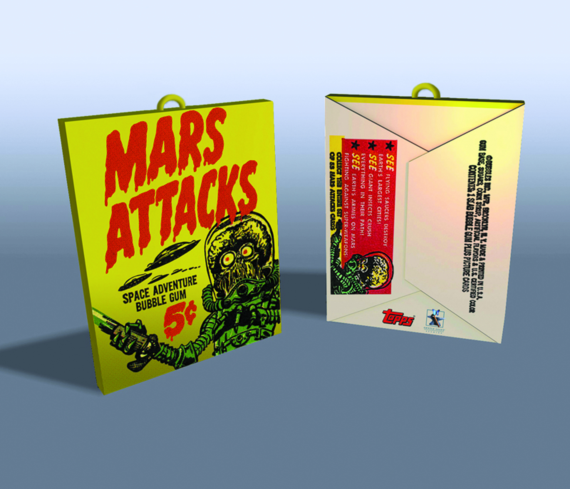 Mars Attacks Topps Ornament is shaped like the original wax-wrapped trading cards and featuring authentic vintage