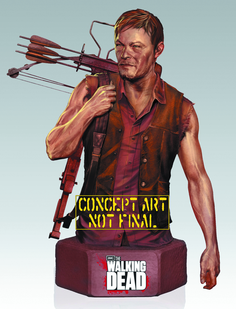 Daryl Mini Bust. This beautiful and intricate bust is digitally sculpted and cold cast using only the highest quality synthetic polystone. From Daryl's signature sleeveless tee shirt to his deadly hunting crossbow, no detail has been overlooked. A limited edition collectable, each hand-painted bust comes individually numbered and includes a matching Certificate of Authenticity.