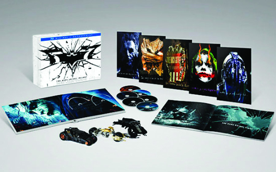 The Dark Knight Rises. The set also includes such exclusive new memorabilia as Premium Mattel Hot Wheels Vehicles (Batmobile, Batpod and Tumbler), newly commissioned collectible art cards by Mondo featuring The Scarecrow, The Joker, Bane, Harvey Dent, and Ra's al Ghul; and a 48-page hardcover book featuring production stills and behind the scenes images from all three movies. Scheduled in stores 09/25/13. (8281)