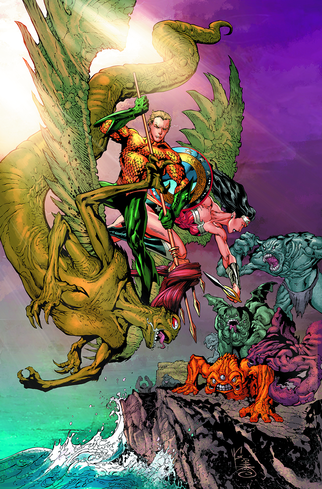 During his battle with Hercules, Aquaman unleashed an ancient evil from the days of the Greeks -- so he's called in Wonder Woman to help him clean up the mess! You can be sure the Queen of the Amazons and the King of Atlantis have plenty to talk about...if they can hear each other over the bloodcurdling screams of the Giant-Born!