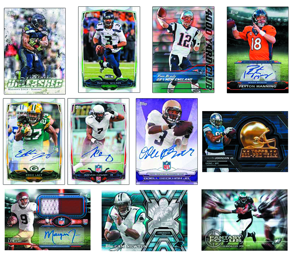 2014 Topps Football! This series pays tribute to iconic Topps designs of the past while "Unleashing the Future" with groundbreaking inserts, beautiful new artwork, and enhanced card content while assuring collectors value with one autograph or relic guarantee per box! The base set consists of 440 total cards, including renowned veterans, up-and-coming rookies, team cards for all 32 NFL teams, 2013 All-Pros, and award winners. Be a part of history as Topps "Unleashes the Future" and debuts fantasy football statistics on its base card backs! 10 cards per pack, 36 packs per box. 43 cards per Jumbo pack, 10 Jumbo packs per box.