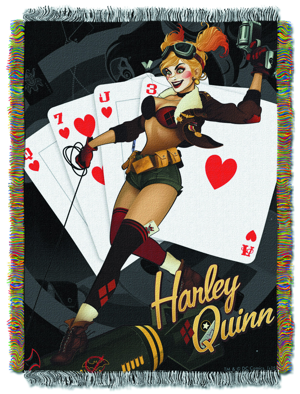A PREVIEWS Exclusive! Bring home your DC Comics Bombshell with this Harley Quinn Tapestry. This measures 46"x60", is made of soft acrylic, and carries vivid detail of everyone's favorite Queen Clown in her Ant Lucia Bombshell costume. Display her over your bed, couch, or even hang it on the wall so you can bask in her 1940s Pin-Up glory. Made in the USA.