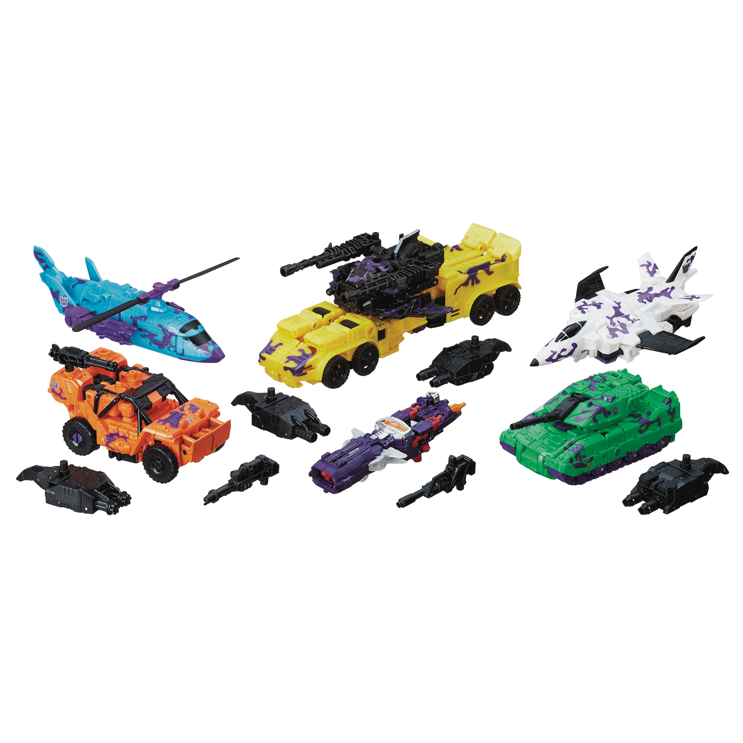 Vortex! Each combining figure converts from robot mode to vehicle mode and back! Includes 5 combining Decepticon figures with weapons to create 1