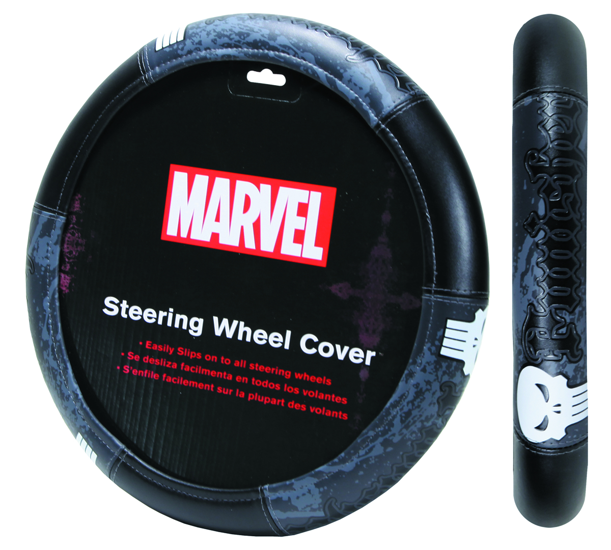 Frank Castle's iconic skull logo adorns this comfortable, leather-like wheel cover, which protects most steering wheels, and your hands, from hot and cold extremes.