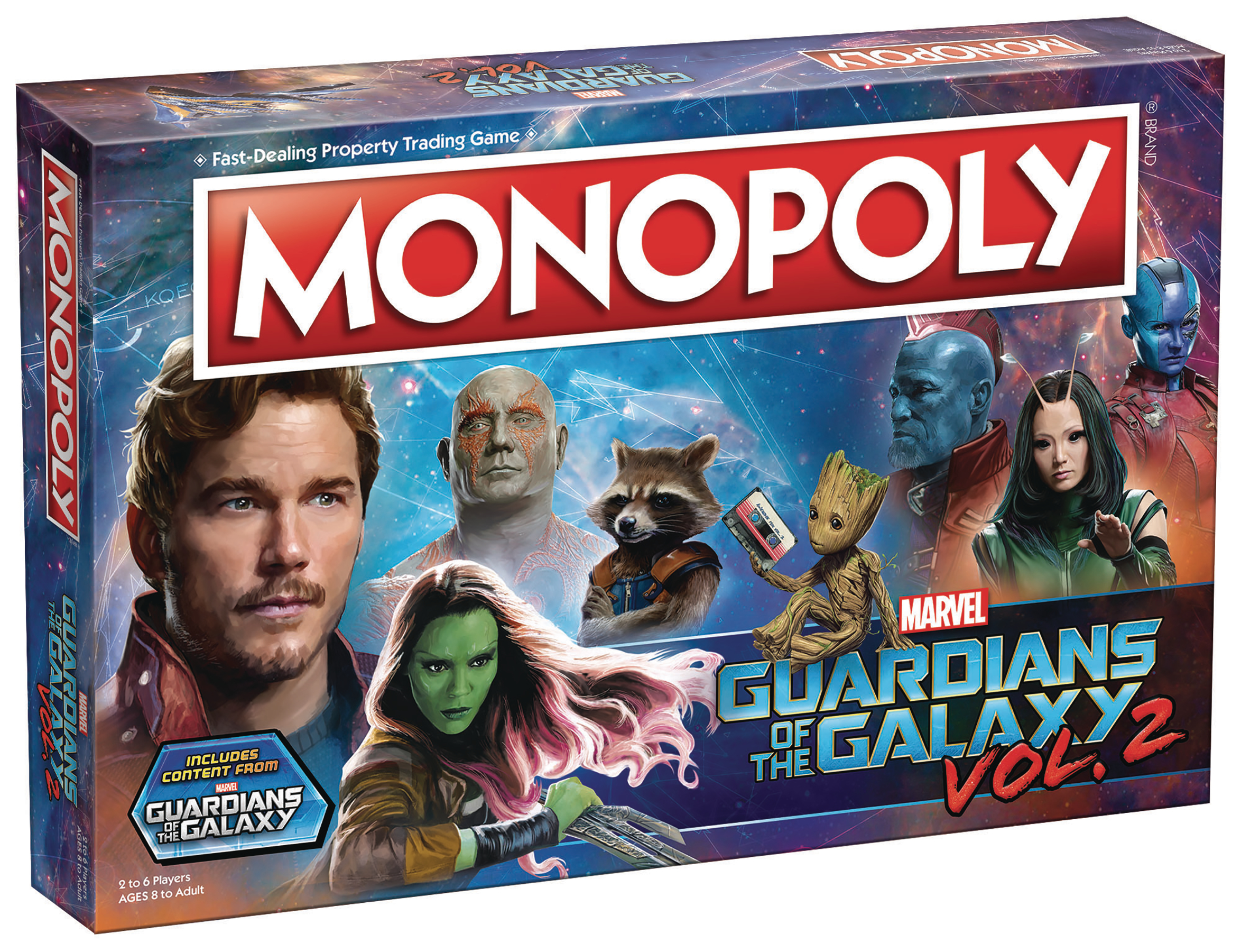 Guardians of the Galaxy Vol. 2 edition of Monopoly offers fans of the Marvel Cinematic Universe a unique game play adventure as they recruit characters from both films, collecting bounties and double crossing their opponents while enjoying the classic table top experience of one of America's favorite board games.