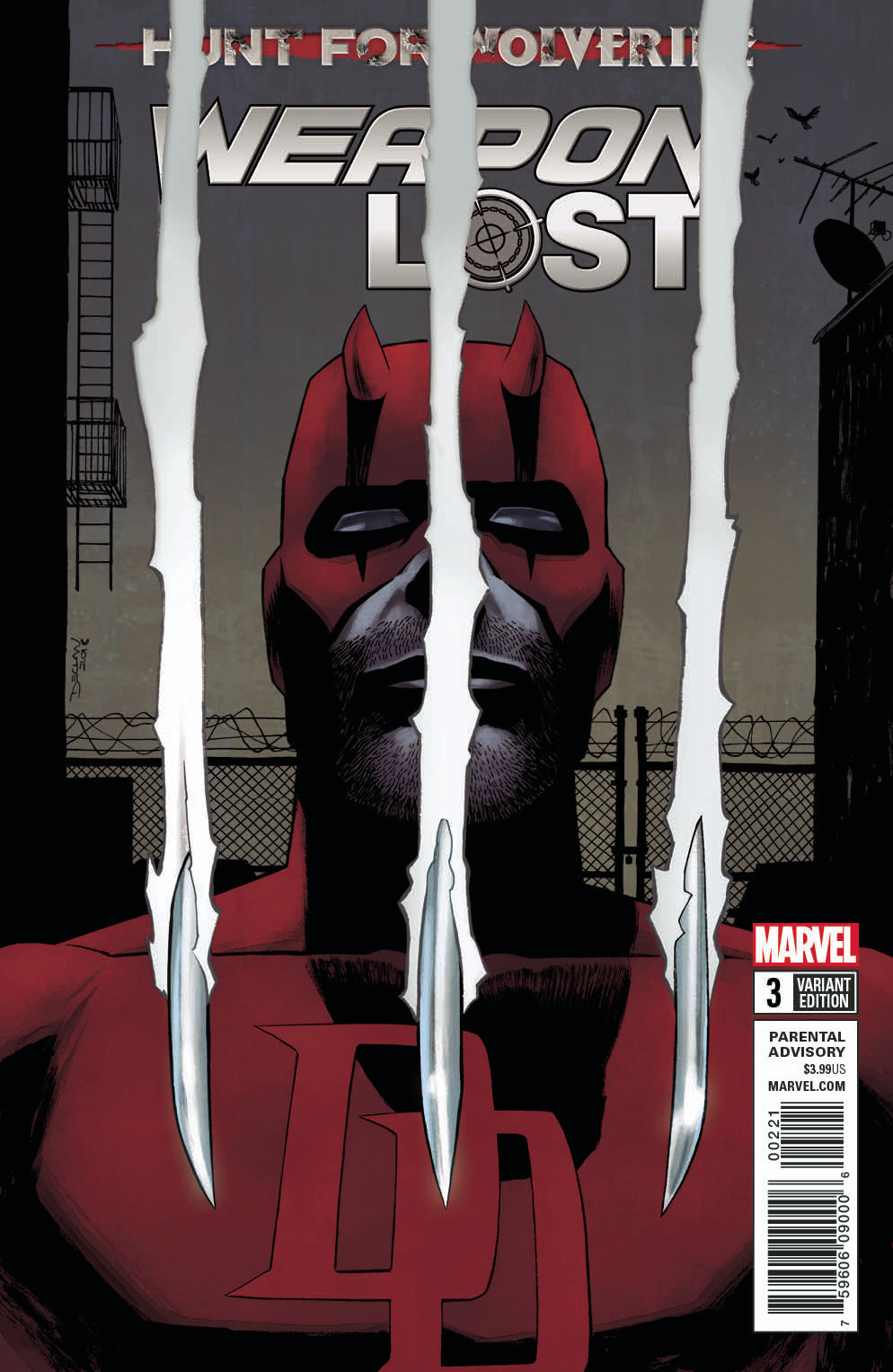 • Deep in Logan's home country, Daredevil and his investigative team have tracked the most recent reports of his appearances...straight to the tips of his still bloody claws!