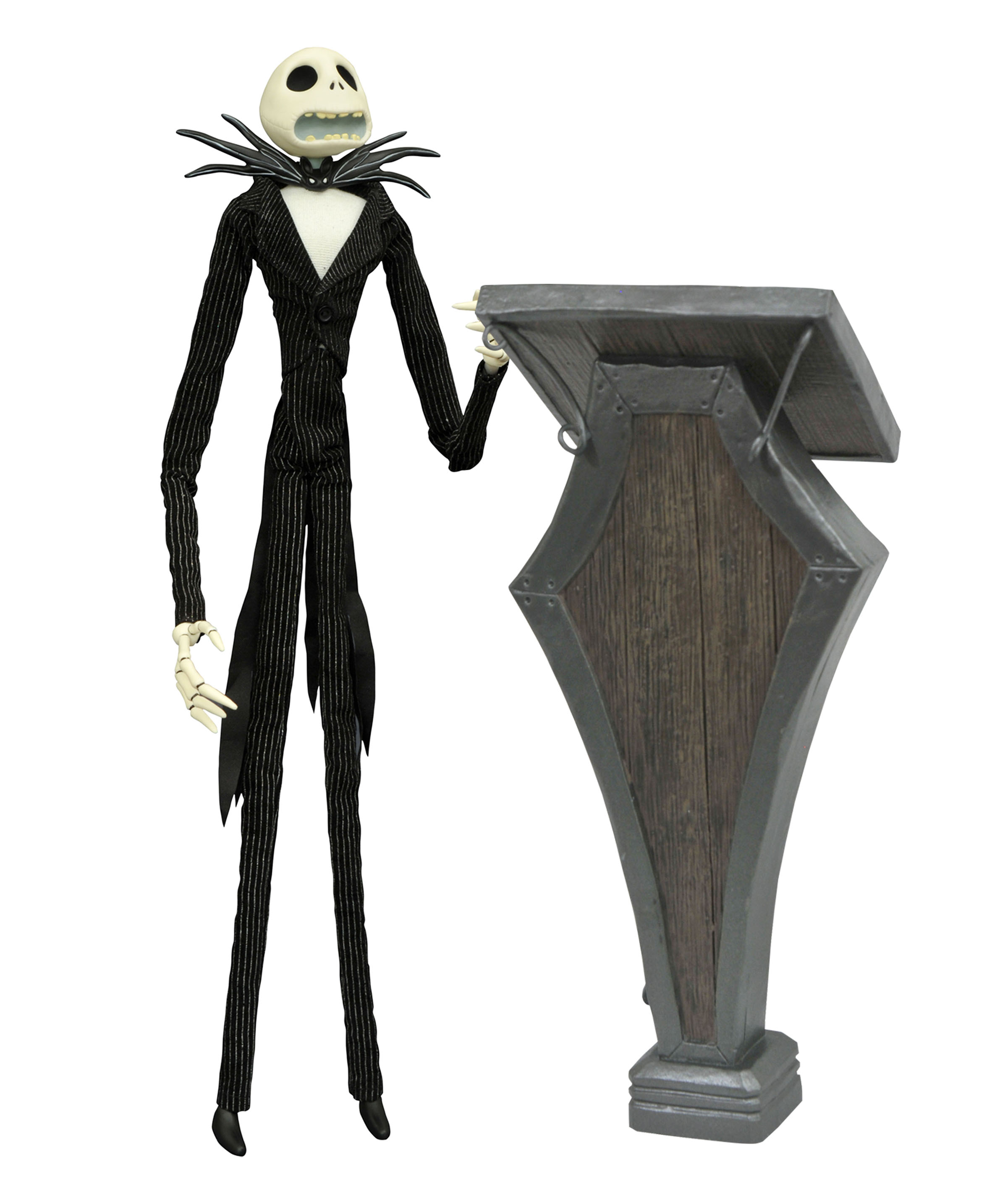 A Diamond Select Toys release! The Coffin Dolls line just got super-sized! Just in time for the 25th anniversary, these two new releases of Jack and Sally from Tim Burton's The Nightmare Before Christmas feature new facial expressions and new accessories - a podium for Jack and a cauldron and spoon for Sally! Each 14" scale doll features a real cloth costume and multiple points of articulation, looking like it just stepped off the big screen! Each comes packaged in an oversized coffin-shaped window box. Heads not final.