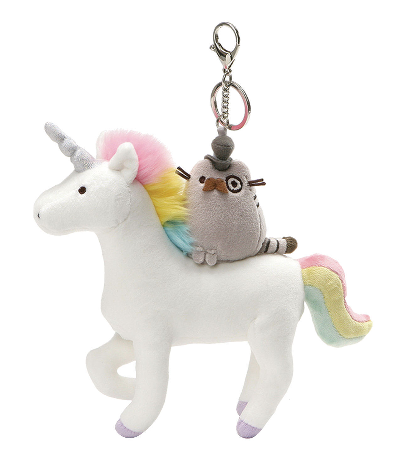 Pusheen! This 8.5" deluxe plush keychain brings her monocle-wearing persona to life as she enjoys a ride on a magical rainbow-maned unicorn! A sturdy metal keychain clip and ring securely shows off