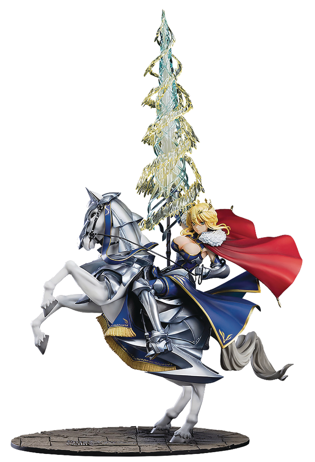 Altria Pendragon, based on her appearance in her third ascension! She is posed riding her beloved steed Dun Stallion in a heroic and mature pose that captures her as if just before making use of her powerful Noble Phantasm. The impressive armor on both the horse and Altria herself gleam with metallic paint effects and in her hand she holds the holy lance, Rhongomyniad, which uses translucent parts for a truly magnificent appearance. Be sure to add her to your side and experience the mighty Lancer and her trusty steed right by your side!